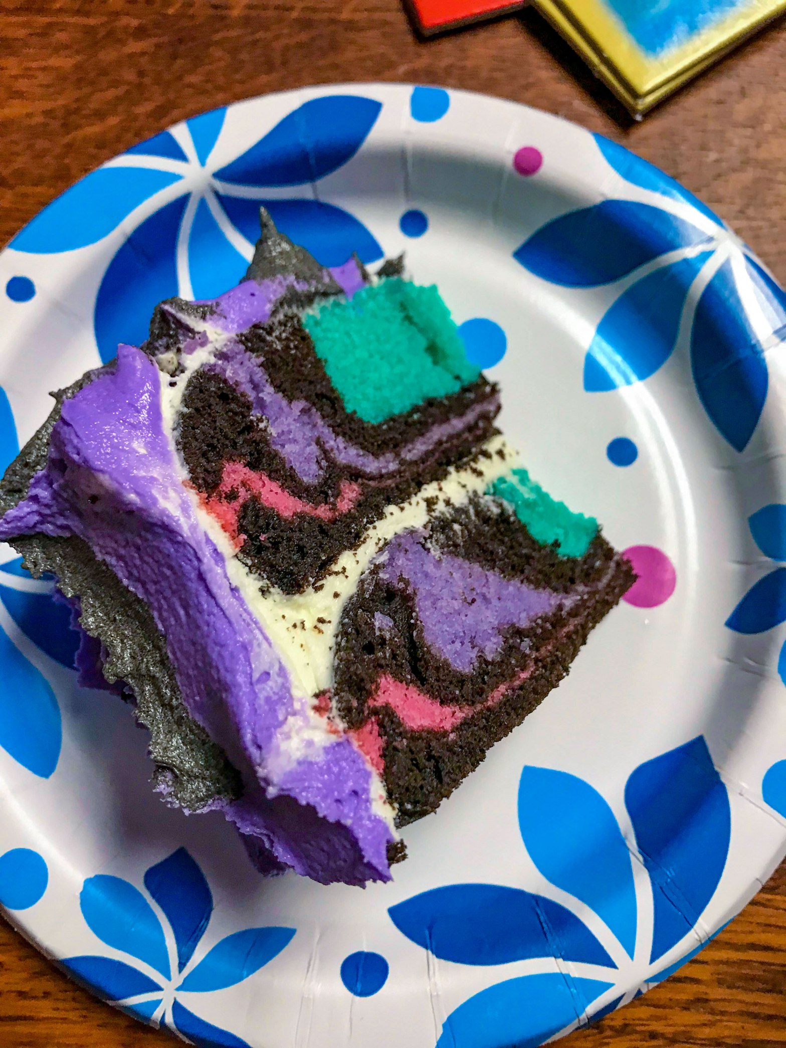 I am super happy with the way this cake turned out! I had no reference for the inside and no idea how it would look, but I love the inside and will definitely be employing this technique again. It’s very easy and looks really impressive. My goal with the coloring was that the black would be Knowsmore’s coat and the multicolors would represent the Internet. I think it worked out well! The cake itself was really yummy and the chocolate buttercream was subtle but delicious.
