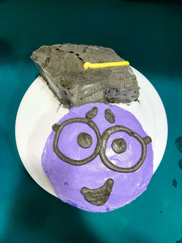 15. Frost the circular part of the cake with the purple and the cap part with the black chocolate buttercream.