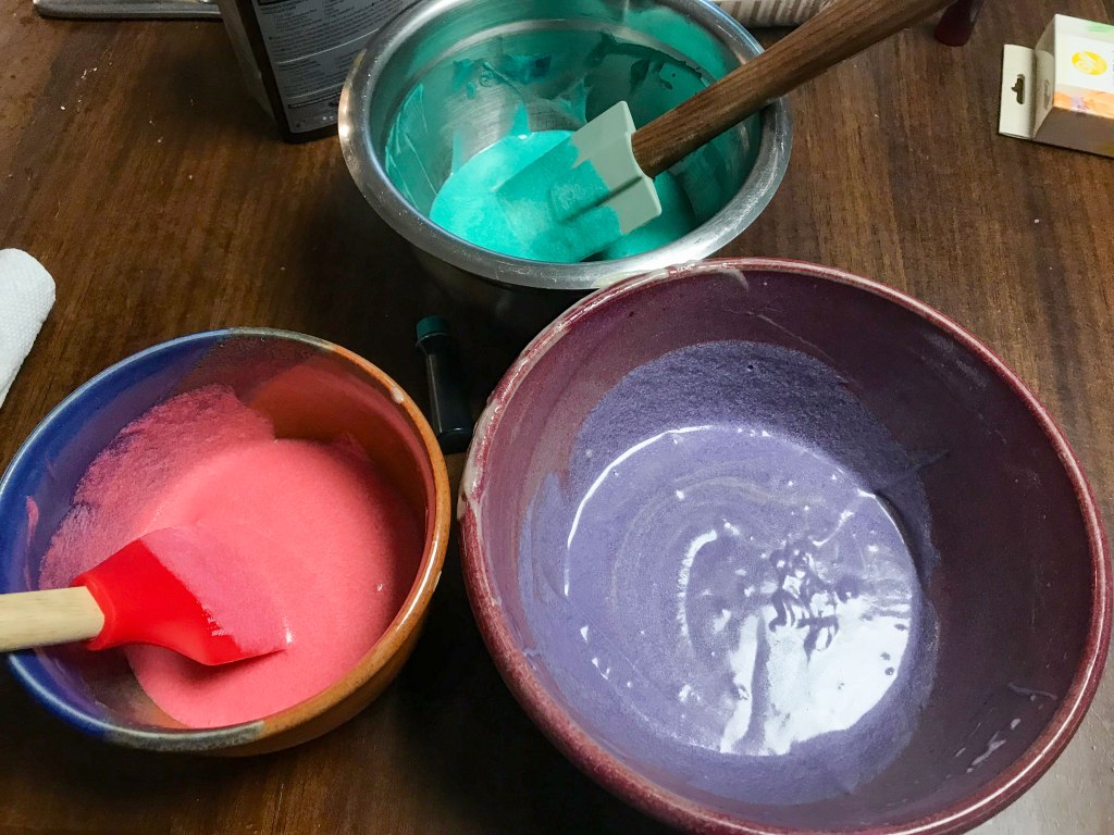 3. Divide the white or vanilla cake batter evenly into three small bowls. Add a generous squirt of gel coloring (I used the purple, teal and magenta from this pack). Mix each thoroughly.